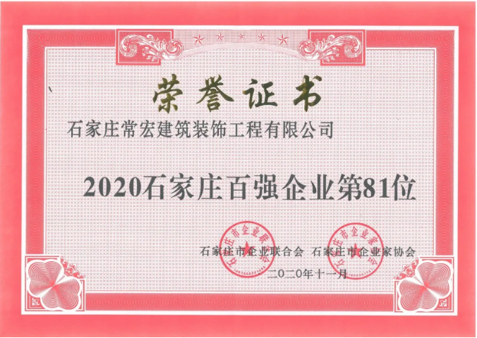 11月28日,在“2020石家莊百?gòu)?qiáng)企業(yè)峰會(huì)”上,石家莊市企業(yè)聯(lián)合會(huì)、石家莊市企業(yè)家協(xié)會(huì)發(fā)布了石家莊市百?gòu)?qiáng)企業(yè)名單并向相關(guān)企業(yè)授牌。常宏入選“2020石家莊百?gòu)?qiáng)企業(yè)”81位。